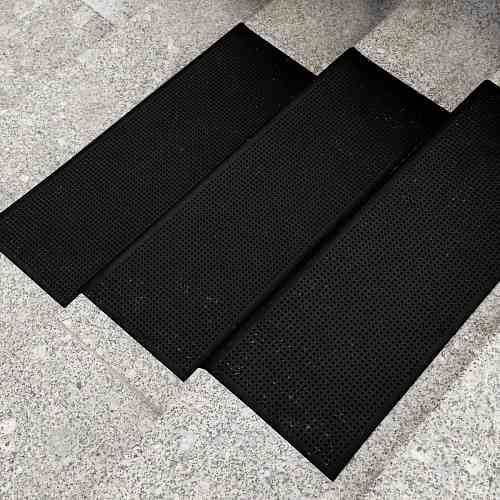 Резиновые коврики на ступеньки лестницы позволяют легко решить проблемы, связанные с обледенением и повышенным травматизмом. Изделия имеют рельефную поверхность, которая замедляет скольжение, их можно расположить посередине ступеньки или поместить на ее край.
